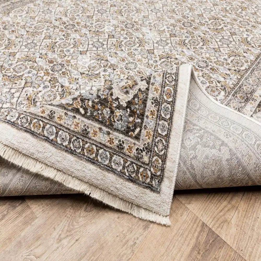 Maharaja is a study in understated elegance. This new million point collection is full of sophisticated traditional designs that have been re-imagined into a lovely new color palette. Timeless neutral tones alongside mellow shades of bluestone and muted amber offer subtle treatments for intricately detailed patterns. These beautiful rugs are powerloomed of incredibly soft, space-dyed polyester.