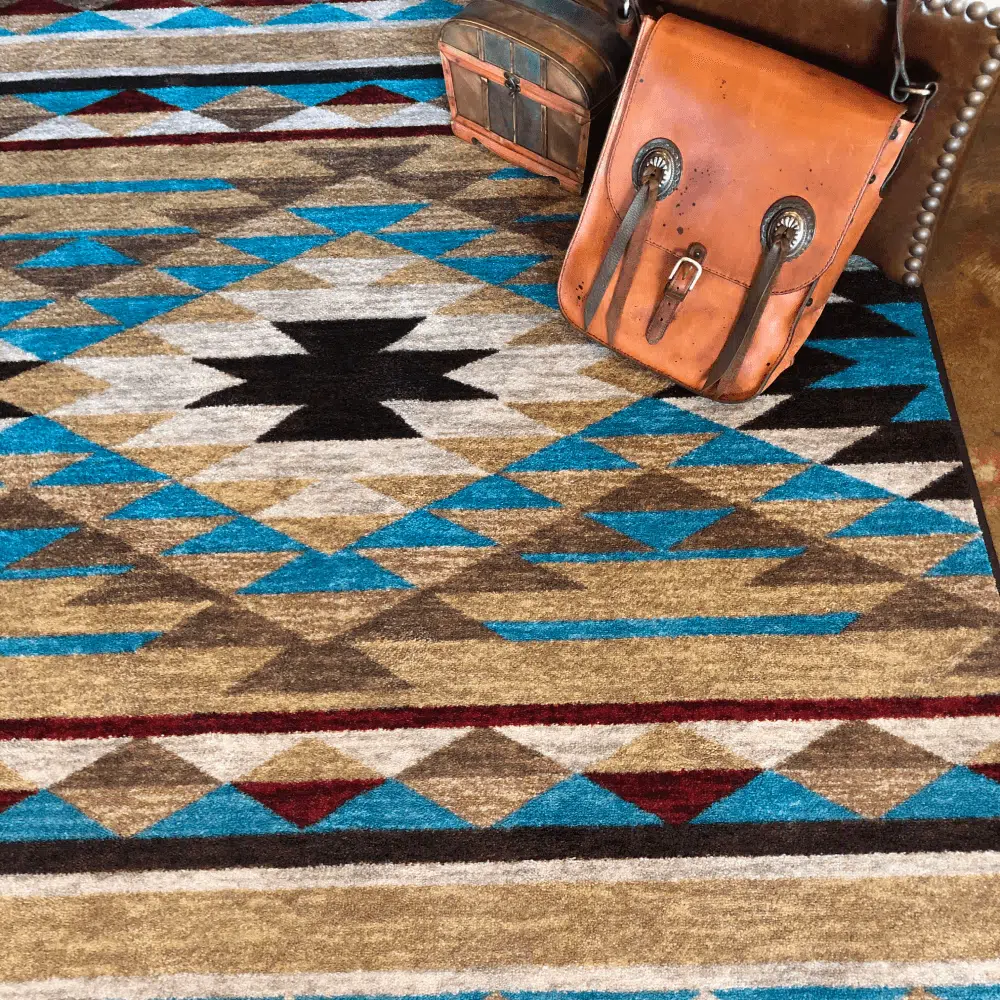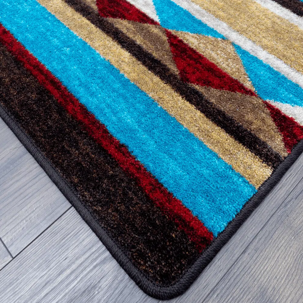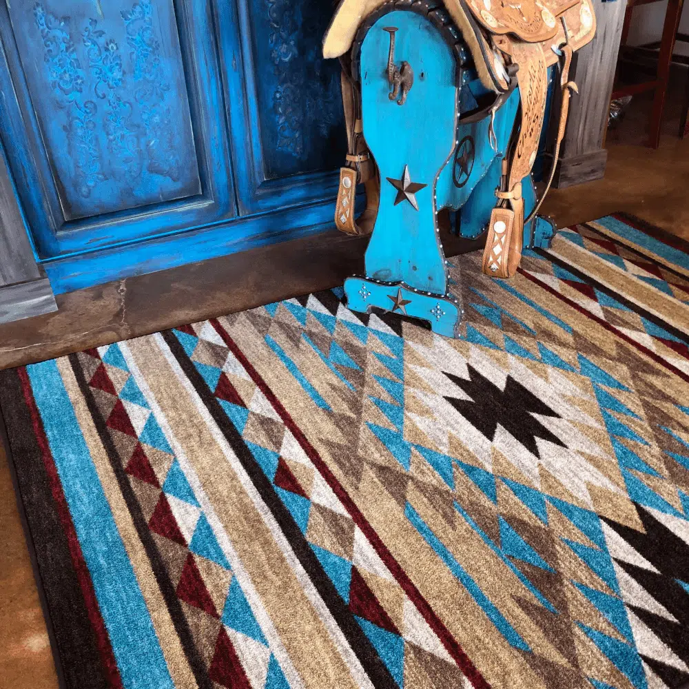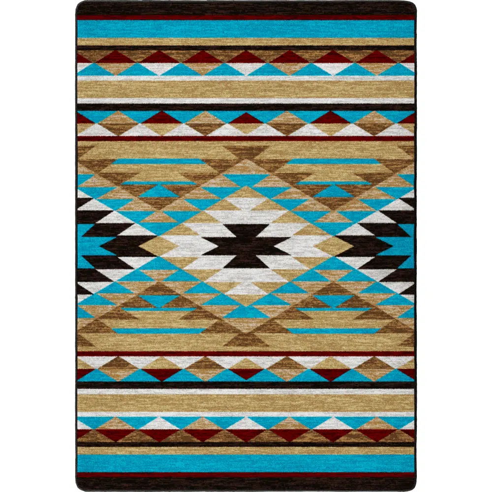 Electric blues and reds offset earthly beiges and browns in this beautiful southwest pattern, with repeating diamond motifs all around.